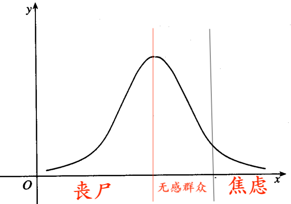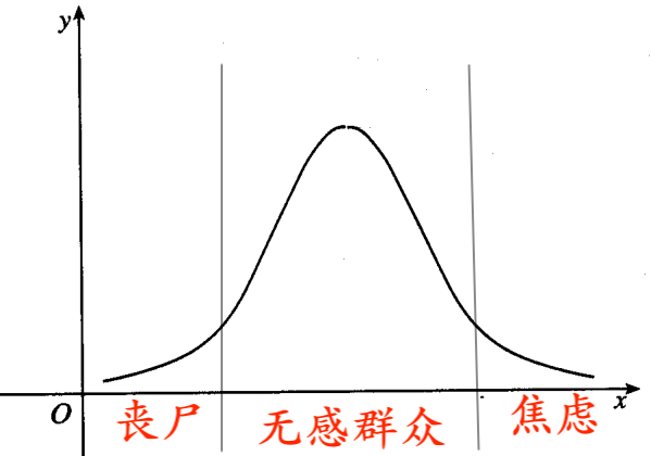 文章寫到這裡,大家應該已經看出來了,喪屍人群和我國比較時髦的焦慮型群眾正好是兩個極端,我畫了個正態分布,大家可以看看: